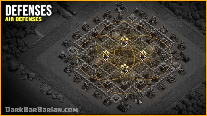 Our air defenses are separated into their own compartments to prevent them from being destroyed together by lightning spells. Their range covers almost the entire base within the walls, and when combined with other air-targeting defenses, this base becomes a real powerhouse against air attacks. Air sweepers are also positioned strategically to push back troops and add an extra layer of protection against strategies like lava loons, mass dragons, and Electro dragons.