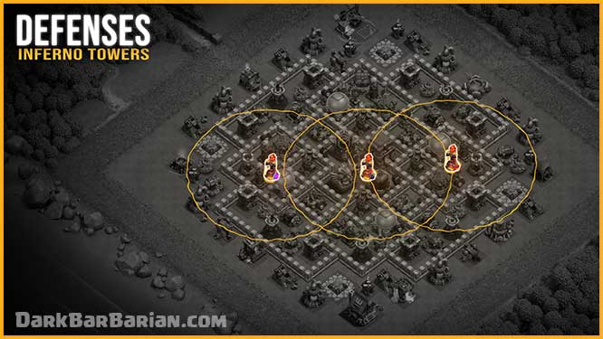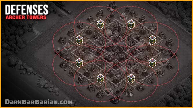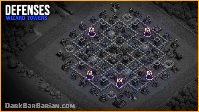 Wizard towers are spread out around the base to prevent them from being taken out by a single spell and to help maintain overall balance. Their positioning also provides splash damage protection to the outer layers of the base.
