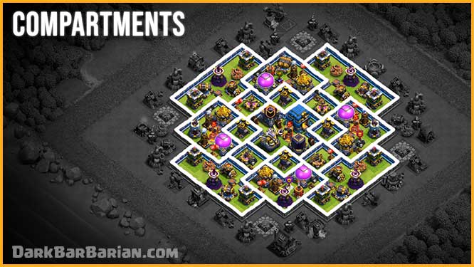 Each outer compartment is reinforced with two archer towers, spaced out carefully to provide consistent protection against both air and ground troops. This setup ensures balanced coverage across the base, making it solid against all types of attacks, no matter the strategy.