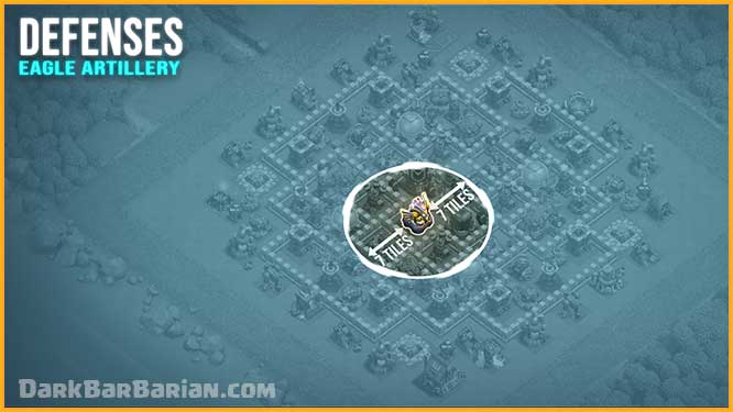 The Eagle Artillery sits right in the central compartment because it’s the strongest defense at Town Hall 12. From there, it covers the entire base, except for the first seven tiles, which are protected by other defenses.