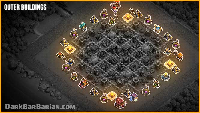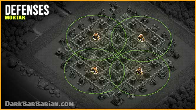 Mortars are placed on the outer compartments, and their primary job is to deal with spam-style attacks like BARCH, G-BARCH, and mass goblins. This placement gives them a wide coverage radius across most of the base.