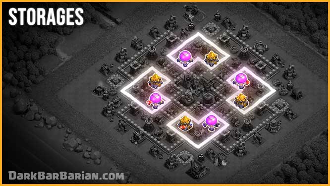 When it comes to storages, we’ve spread them out across several compartments. A common mistake new base builders make is grouping all storages in one area, which makes it easy for attackers to loot everything once they break in. In our design, attackers must destroy the entire base to steal all your resources. Also, we avoid placing the same type of storage on the same side — for example, putting both gold storages together would allow the enemy to steal almost all your gold by destroying just this one section of the base. So in order to avoid that, we alternate them, just like in this layout.