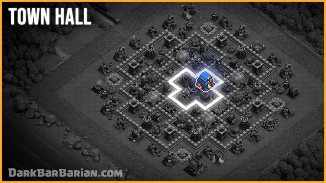 First and foremost, the Town Hall is placed safely inside the central compartment of the base, which is exactly where you want it. Keeping it well protected is crucial since it’s worth one star and stores a big chunk of your loot in it.
