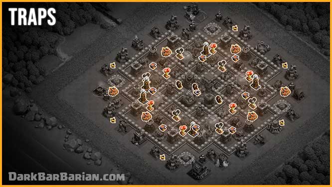 Now, let’s talk about traps. After analyzing countless attack replays, we’ve positioned spring traps and giant bombs based on typical troop pathing. This makes the base much stronger against ground troops like hogs and giants.