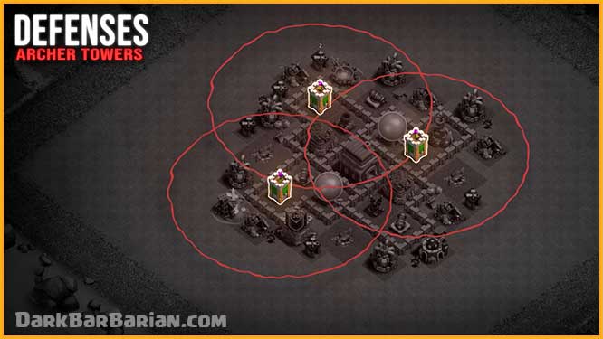 The Archer Towers are placed around the base so that their ranges overlap and cover nearly the entire layout. This provides strong all-around protection against both air and ground troops.
