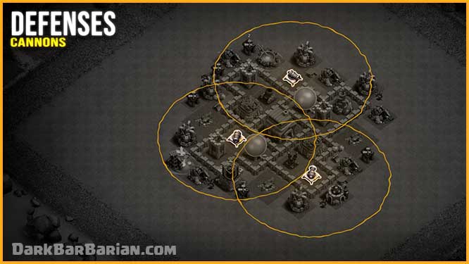 The Cannons are spread evenly throughout the base to defend against ground attacks and to support other defenses during Giant-based strategies.
