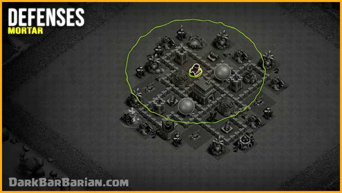 The Mortar is positioned so that its splash radius covers a large portion of the base. This makes it very effective against spam strategies like BARCH, GiBARCH, and Mass Goblins, as it can take out groups of low-HP troops before they cause serious damage.