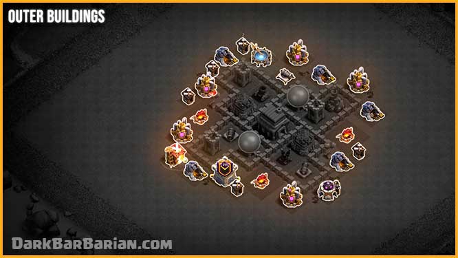 All of the defenses are positioned in a way that ensures balanced coverage from every side, making the base strong no matter where the attack starts.