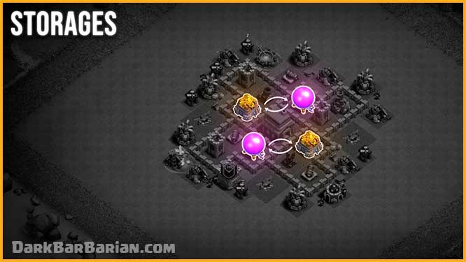 Additionally, we’ve arranged them alternately — so even if one side of the base is destroyed, you won’t lose all storages of the same resource. For example, if all Gold Storages were on one side, the attacker could steal almost all your gold by focusing just there. And if we are losing loot, it is better to lose it in a balanced way rather than losing all of the loot of one kind of resource, so we arrange them alternately, much like our base.