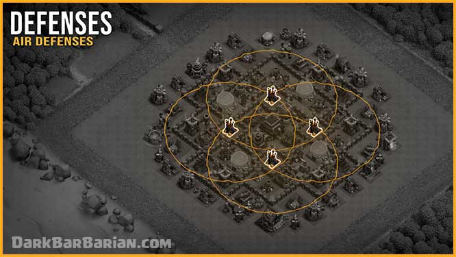 When it comes to Air Defenses, they’re placed in individual compartments so they can’t be destroyed together by lightning spells. Their positioning is designed to cover a large portion of the base, ensuring that air troops are always within range no matter where they attack from. Air defenses are paired with Air Sweepers, they provide solid resistance against popular air strategies like LavaLoon and mass Dragons.