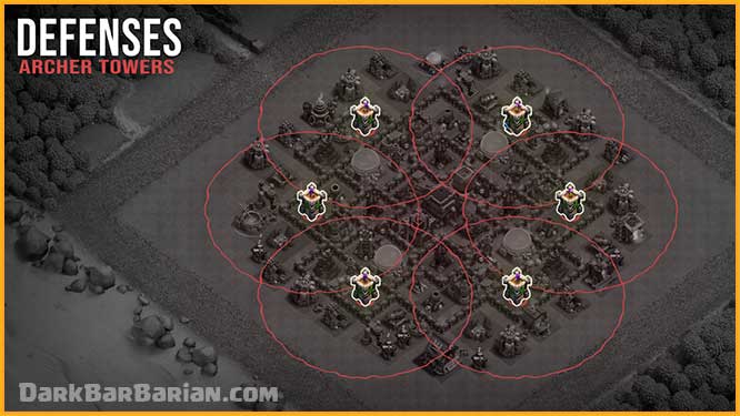 Archer Towers are distributed evenly around the base, ensuring that their range covers the entire layout. This guarantees strong and consistent protection against air attacks from every direction.