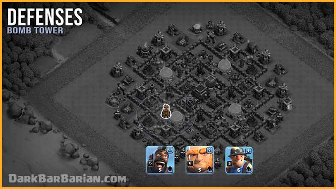The Bomb Tower acts as a powerful trap against Hog Riders, Giants, and Miners. It attracts defense-targeting troops and deals massive damage when it goes down, making it a major threat to ground-based armies.