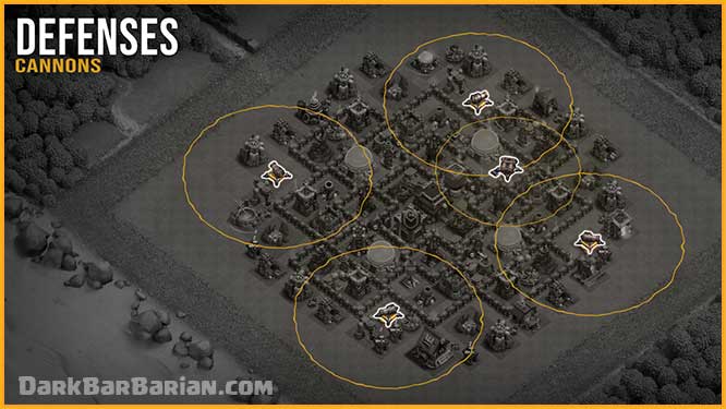 Cannons fill in the remaining defensive gaps throughout the base, helping maintain overall balance and strengthening the base against ground-focused attacks.