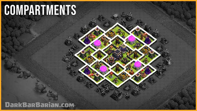 Another major highlight of this base is the large number of compartments used throughout the layout. These compartments are designed to slow down enemy troops significantly. Troops like Giants and Golems often struggle with pathing, getting stuck on walls while our defenses continuously deal damage, which can easily lead to time failures or incomplete attacks.