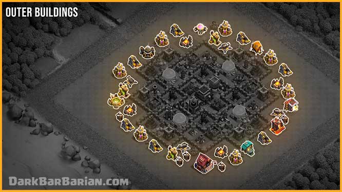 As for the outer buildings, their placement is flexible depending on how active you are. If you play regularly, you can spread them out more to make funneling harder, since you’ll be collecting loot frequently. If you’re less active, you can keep them closer to defenses like in this layout so they stay protected. Just remember not to group the same type of collectors together, or attackers can steal all your loot very easily.