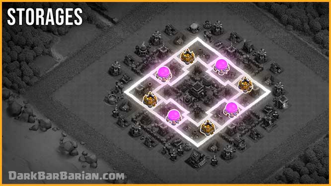 We’ve also placed the storages alternatively, so that even if the opponent takes out this portion of the base, we don’t lose all the storages of the same kind of resources, for example, if we put all the gold storages on this side of the base, the attacker can take almost all your gold just by taking out this portion of the base. and if we are losing the loot, it’s better to lose it in a balanced way rather than losing all the loot of one kind of resource, so to avoid that, we place them alternatively, just like our base.