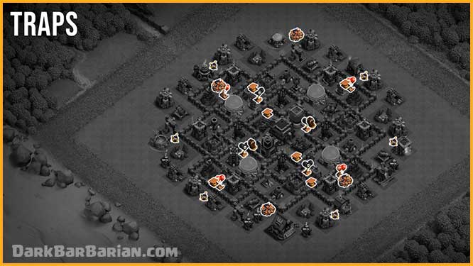 We’ve also placed bombs outside the walls to take out Wall Breakers. This can completely disrupt an attacker’s funnel, forcing troops to move toward outer trash buildings instead of entering the base, which often results in a failed attack.