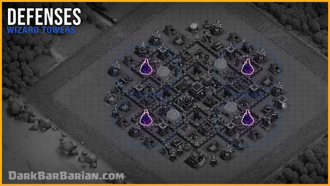 At Town Hall 9, Wizard Towers are the only splash defenses that can hit both ground and air troops, so they play a very important role. We’ve placed them in separate compartments to prevent all of them from being taken out by lightning spells at once. This spread also allows them to provide splash coverage across a wide area, protecting both core defenses and outer structures.