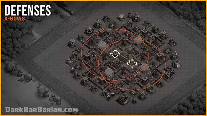 The X-Bows are kept extremely safe inside the central compartments of the base. From here, they cover a large portion of the layout and protect several key defenses. They are set to target both ground and air troops, making them effective against any type of attack. Because of their central placement, they’re often among the last defenses standing.
