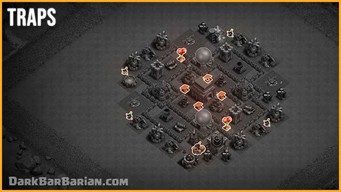 Now coming to the placement of the traps, after observation of so many attacks on this base, spring traps and giant bombs are strategically placed on different places according to the pathing of defense attacking troops like hogs and giants, which helps in making this base stronger against ground attacks.