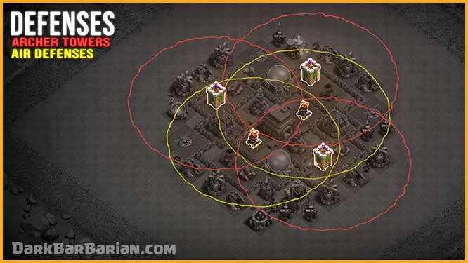 The Archer Towers are placed in a triangular formation, giving solid air and ground coverage across the entire base.