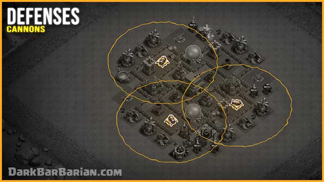 The Cannons are placed where they help balance out the base’s ground defense, giving good coverage in areas where Archer Towers might be weaker for ground defense.