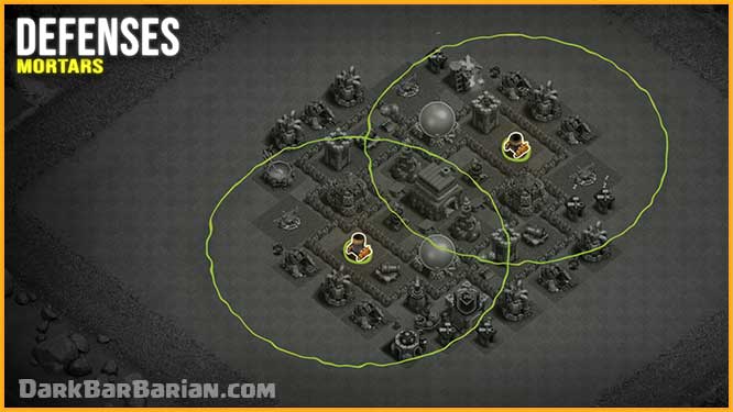 The Mortars are placed toward the outer areas of the base, where they can counter common attack strategies like BARCH, Gi-BARCH, and mass Goblins before those troops reach the more valuable defenses. They cover a large portion of the base, and their splash damage is great for wiping out multiple low-health troops at once—especially when they’re packed together.