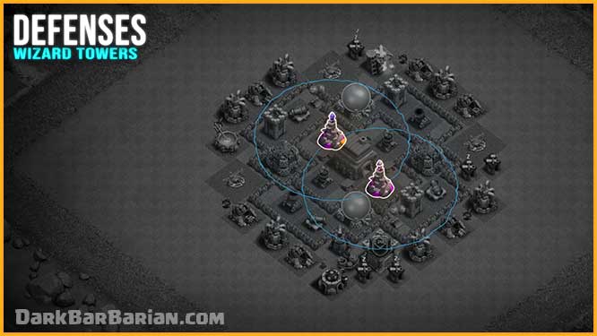The Wizard Towers are positioned in a way that allows them to protect the core defenses and the Town Hall, while their splash damage range also covers most of the outer defenses and storages, maximizing their effectiveness.