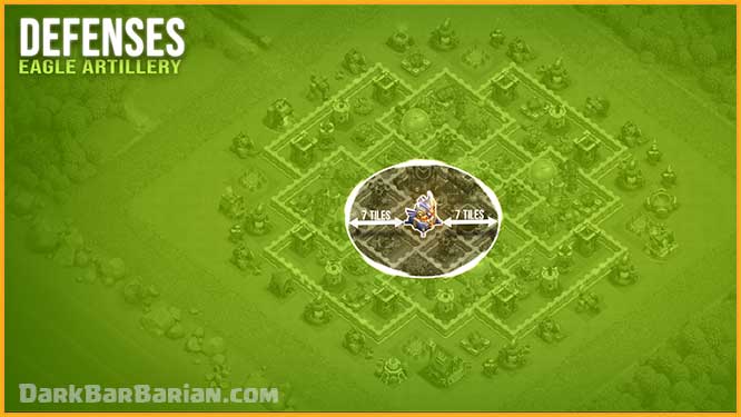 At the center, we’ve got the Eagle Artillery, the most powerful defense at Town Hall 11. It covers the entire base, leaving just the first 7 tiles unprotected. Since it’s surrounded by high-HP buildings and protected by Infernos and X-Bows, it’s really hard for enemies to reach it early in the attack.