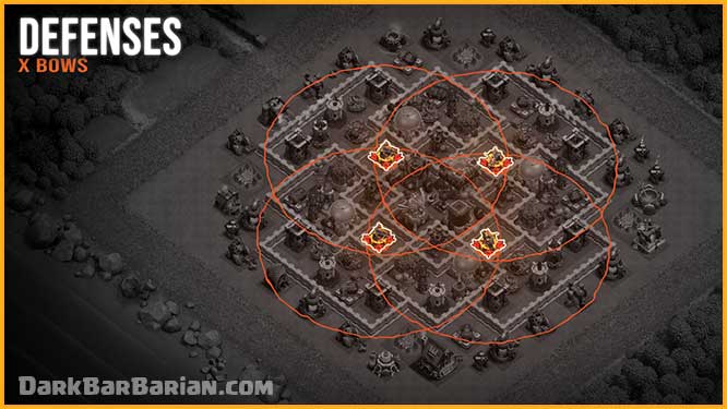 The X-Bows are distributed evenly in four key compartments and set to both ground and air mode. That setup gives them maximum coverage and flexibility since both types of attacks are common at Town Hall 11.