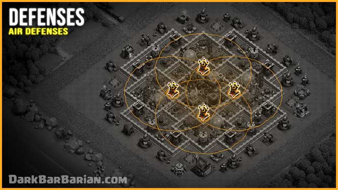 Air Defenses are placed in separate compartments toward the core of the base. This placement makes it extremely difficult for attackers to destroy multiple air defenses using a single Lightning Spell combo. Their reach spans nearly the entire base, giving robust air protection. Combined with the Air Sweepers, which are directed diagonally, they help push back LavaLoon, Dragon, and Electro Dragon attacks.