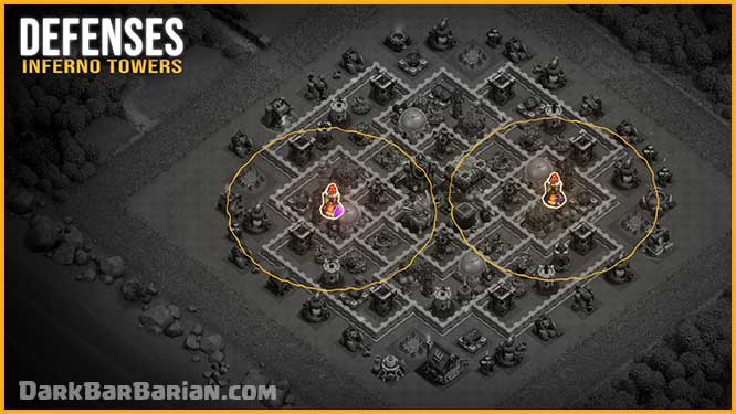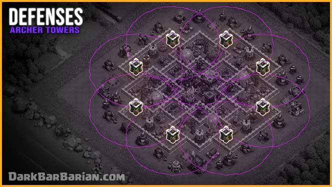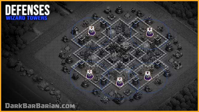 Wizard Towers are placed on the outer ring of the base. This placement helps protect your loot from groups of troops like Minions, Bats, and Goblins, using splash damage to clear them quickly. They’re also spaced apart so they can’t be all zapped down by Lightning Spells at once.