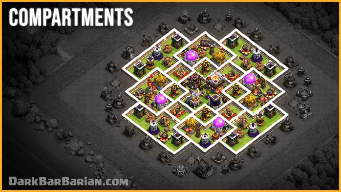 One of the best aspects of this base is the compartmentalization. There are several compartments throughout the layout, which slow down enemy troops and break their pathing. Units like Giants, and Golems get stuck on walls, wasting time while your defenses pick them off one by one.
