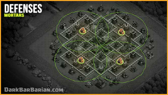 The Mortars are placed in outer compartments, which is great for dealing with spam attacks like BARCH, G Barch, and Mass Goblins. They cover the outer buildings effectively while still reaching into inner sections when needed.