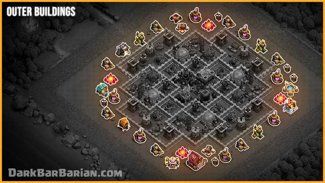 When it comes to the outer buildings, I’ve placed them in an alternatively to avoid placing the same type of collectors and mines close together. I’ve noticed that most people don’t think about it when placing those outer buildings, so they end up putting the same type of collectors or mines all together. These collectors and mines become an easy target for attackers when placed together, so it’s important to spread them out to make it harder for them to be taken out.