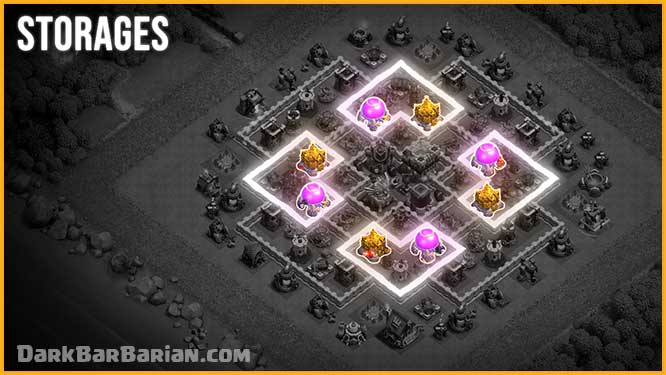 When it comes to storages, they’re spread across multiple compartments. A lot of poor base designs place all storages together, which makes it easier for attackers to loot everything. Here, each storage is separated so attackers have to clear the whole base to get all your resources. We’ve also made sure that the same types of storages aren’t placed on the same side—so attackers can’t just grab all your gold or elixir from one area. for example, if we put both gold storages on this side of the base, the attacker will be able to grab almost all of your gold merely by destroying this portion of the base. As a result, in order to avoid this. We alternate their placement, much like this base.