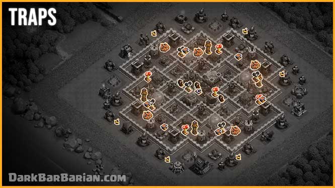 Now let’s discuss trap placements — I’ve carefully analyzed troop pathing, and after analyzing, spring traps and giant bombs are strategically placed in different compartments according to the pathing of defense attacking troops like hogs and giants, which helps in making this base stronger against ground attacks.