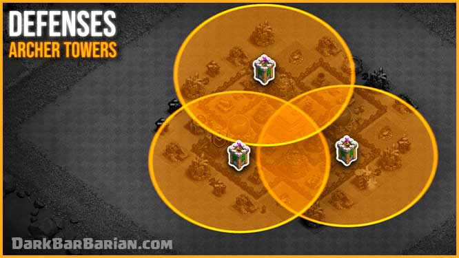 Since Archer Towers can attack both ground and air troops, spreading them around the layout ensures there are no weak spots where attackers can easily approach from.