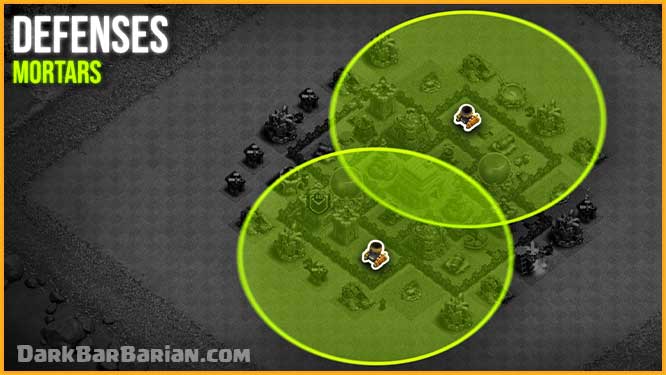 The Mortars are positioned slightly away from the exact center but still well protected inside compartments. Mortars are extremely important at TH6 because they counter common farming armies like BARCH, GiBarch, and mass Goblins. Their splash damage can eliminate groups of low-health troops very quickly.
