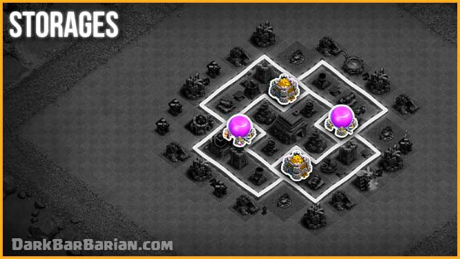 It’s also important to never place the same type of storage on the same side of the base. For instance, if we put both gold storages on one side, the attacker could easily grab nearly all of your gold by destroying that part of the base, so to avoid that, we place them alternatively, just like our base.