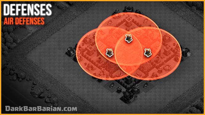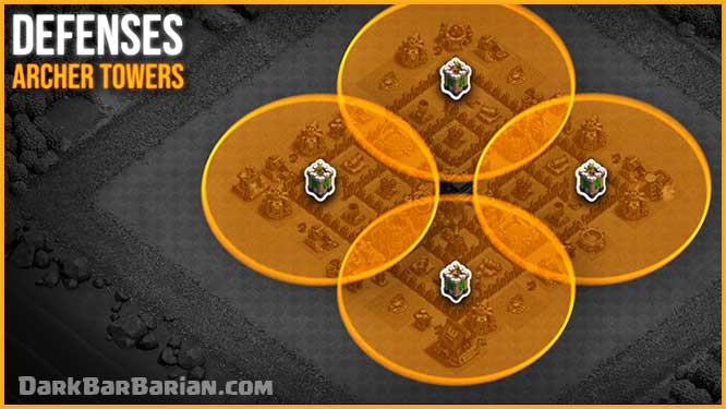 The Archer Towers are spread around the base so that every side has good air coverage. This prevents attackers from finding a weak side to deploy air troops like balloons or dragons.