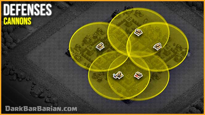 The Cannons are positioned around the base to strengthen the defense against ground troops like giants, barbarians, and hog riders. They work with other defenses to slow down and eliminate incoming ground armies.