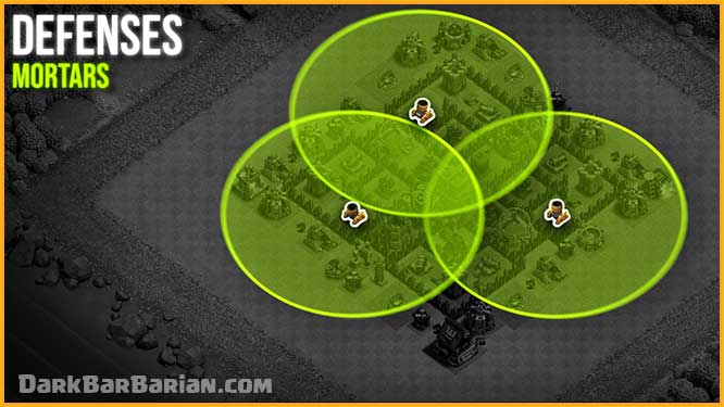 The Mortars are positioned in separate outer compartments. Their splash damage covers a large portion of the base, making them very effective against spam attacks like BARCH, G-BARCH, and Mass Goblins, which are extremely common at Town Hall 7.