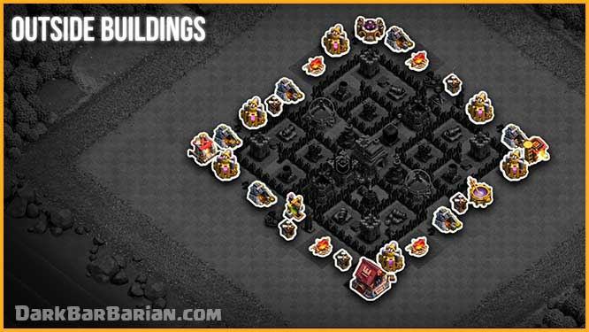 If you play regularly, you can spread the outer buildings further apart to make funneling harder for attackers. Since you collect resources often, you won’t have to worry too much about losing loot from collectors.