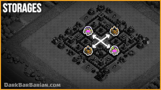 never put the same type of storages on one side of the base, for example, if we put both the gold storages on this side of the base, the attacker can take almost all your gold just by taking out this portion of the base. so in order to avoid that. we place them alternatively, just like this base.