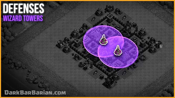 The Wizard Towers are placed closer to the center of the base. Keeping them protected allows them to survive longer during attacks while providing splash damage against both air and ground troops.