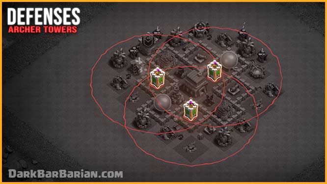 The Archer Towers are placed strategically so their coverage overlaps and protects the entire base from all directions, both air and ground.