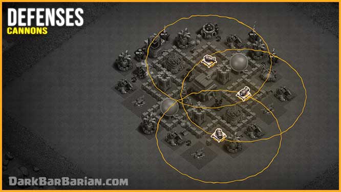 Meanwhile, Cannons are spread out to provide balanced ground defense and support other defensive structures.