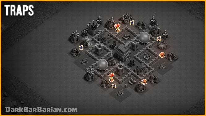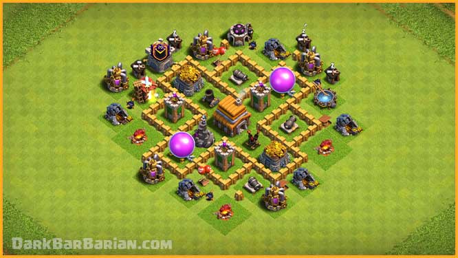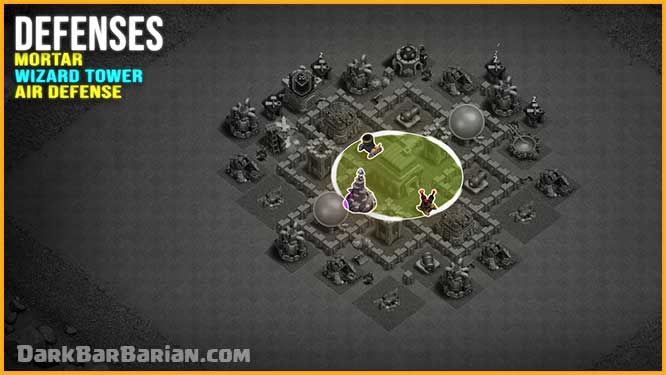 At Town Hall 5, the Mortar, Wizard Tower, and Air Defense are your most critical defenses, so we’ve positioned them inside the main compartment where they’re well-protected and can stay active for as long as possible.