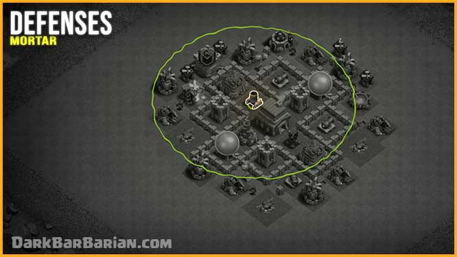Mortar is placed in a way that its splash radius covers a large section of the base. It’s excellent against swarm strategies like BARCH, GiBARCH, or Mass Goblins, clearing out low-health troops before they can cause major damage.